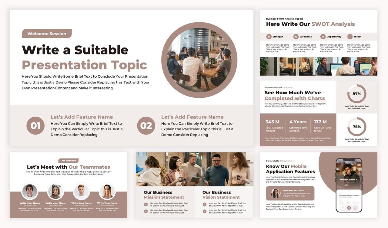 This template includes useful sections for introducing the presentation, explaining mission and vision, describing services and plans, presenting team members, building a SWOT analysis, listing key business points, comparing packages, showing mobile app features, and sharing progress data with charts. The layouts help users turn company information into a polished story that is easy to scan and customize.