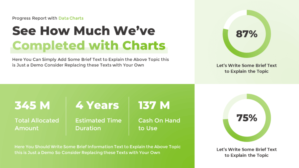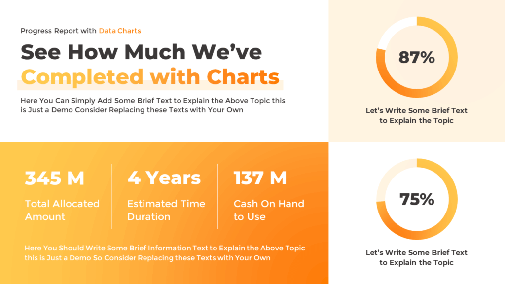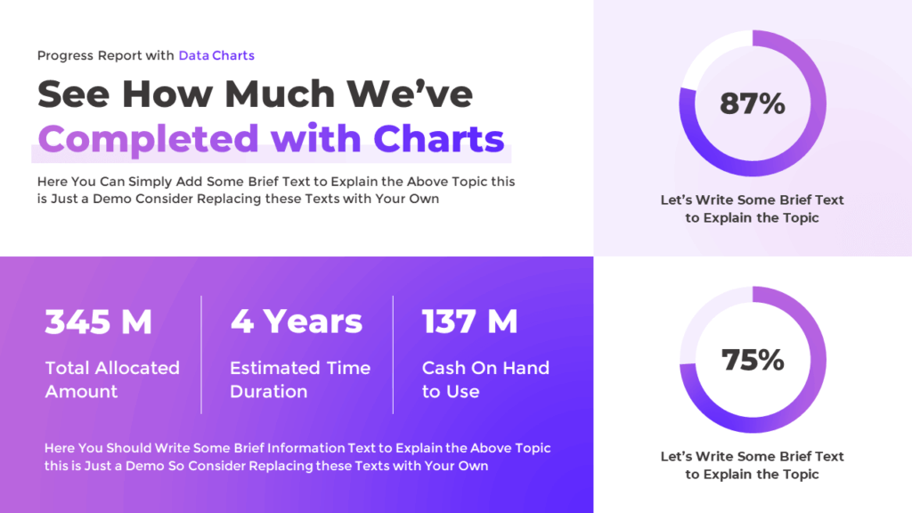 This percentage pie chart template is great for reporting project completion, financial updates, or performance reviews. It uses donut-style charts to make percentage completion clear at a glance. It is especially useful when you want to combine financial numbers with visual progress indicators for better understanding.